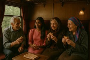 اول ما دخلوا القطر طلبوا شاي و الست نعمات طلعت سندوتشات بيتي، و الحاجة فتافيت السكر كانت مجهزة ترمس الشاي و النعناع الأخضر “الورور” على رأيها، اللي هى زرعاه في البلكونة….